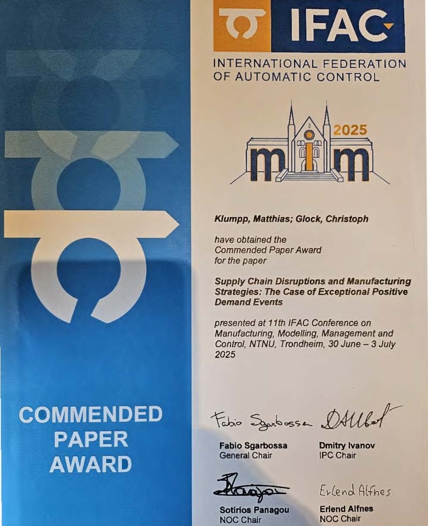 What a great success for our team: Three Commended Paper Awards at the latest IFAC MIM2025 – 11th IFAC Conference on Manufacturing Modelling, Management and Control! The first paper entitled “Human robot collaboration in warehousing operations: a sociotechnical analysis” investigates the impact of different types of robots on physical, mental, perceptual and psychosocial human factors. The second paper, “Considering Aging Workforce Characteristics in Production Scheduling: Literature Review and Extended Job Shop Modelling Approach”, presents the results of a systematic literature review on how ageing factors have been considered in job shop scheduling models so far, and it proposed an extended dual resource constrained job shop scheduling model based on the insights of the review. The third paper entitled ”Supply Chain Disruptions and Manufacturing Strategies: The Case of Exceptional Positive Demand Events”.
